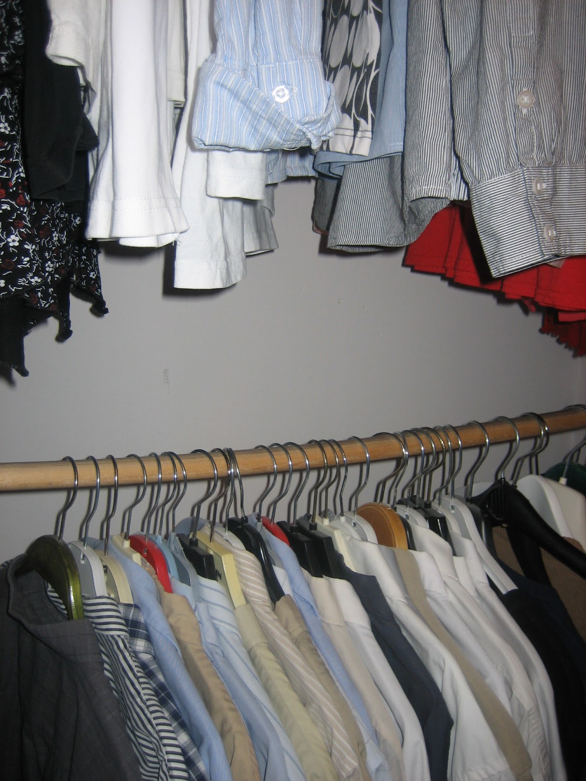 Makens kläder är nu på den nedre stången. Trots att han är längre än mig så nu när han har drabbats av LBD så når han inte längre lika långt upp. Bra gymnastik för mig!